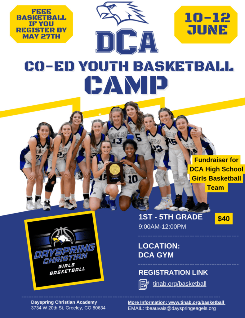 Were are so excited to host the 2nd annual Youth DCA Basketball Camp! This fundraiser will help support the DCA High School Girls Basketball Program